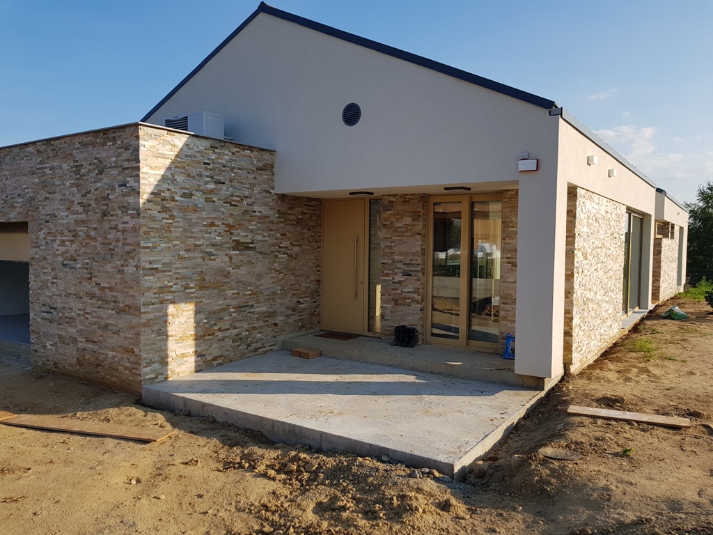 technologia: ściany z pustaków ceramicznych ocieplone styropianem, pokrycie dachu blachą na rąbek, tynki gipsowe.